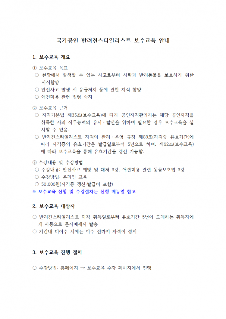 국가공인 반려견스타일리스트 보수교육 공고