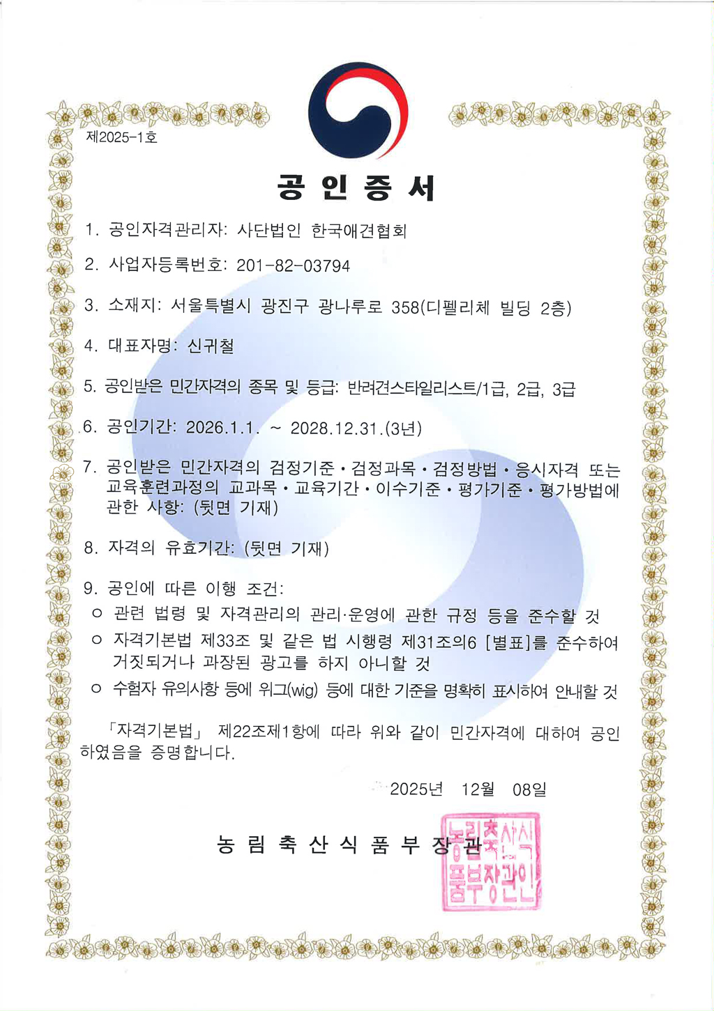 | 등록번호 | [등록번호]2008-0630 [공인번호]농림축산식품부 2019-1호 [공인]1급, 2급, 3급 [비공인]사범 |