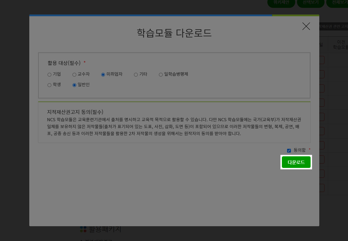 4. 학습모듈(첨부파일) - 활용 대상 체크 후 다운로드